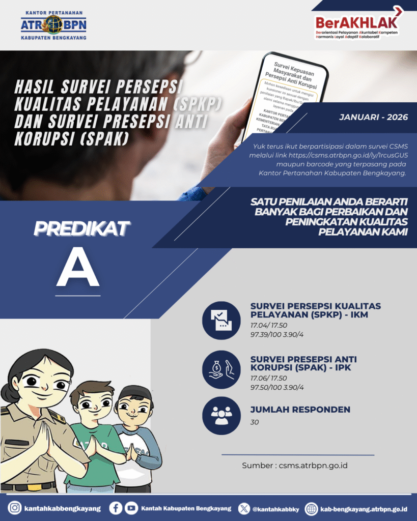 Bengkayang – Kantor Pertanahan Kabupaten Bengkayang menyampaikan hasil Case Survey Management System (CSMS) bulan Januari 2026 yang menunjukkan capaian membanggakan. Dalam Survei Persepsi Kualitas Pelayanan (SPKP) atau Indeks Kepuasan Masyarakat (IKM) serta Survei Persepsi Anti Korupsi (SPAK) atau Indeks Persepsi Korupsi (IPK), kantor tersebut meraih predikat nilai Sangat Baik (A).